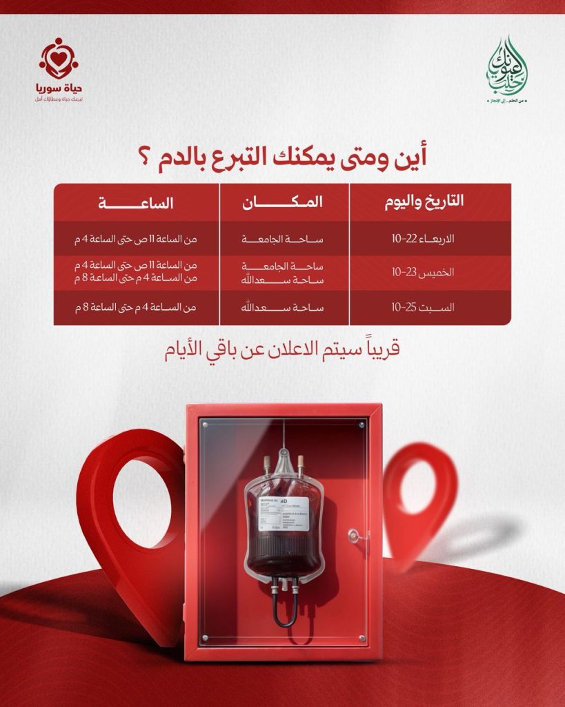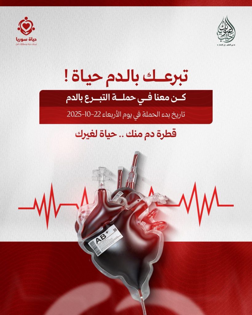 بهدفِ تعزيز ثقافة العطاء الإنساني ، تُطلق منظّمة حياة سوريا بالتّعاون مع عددٍ من الكُلّيّات الجّامعيّة حملة وطنيّة للتبرع بالدم تحت شعار : ( قطرة دم منك … حياة لغيرك )