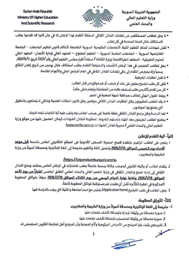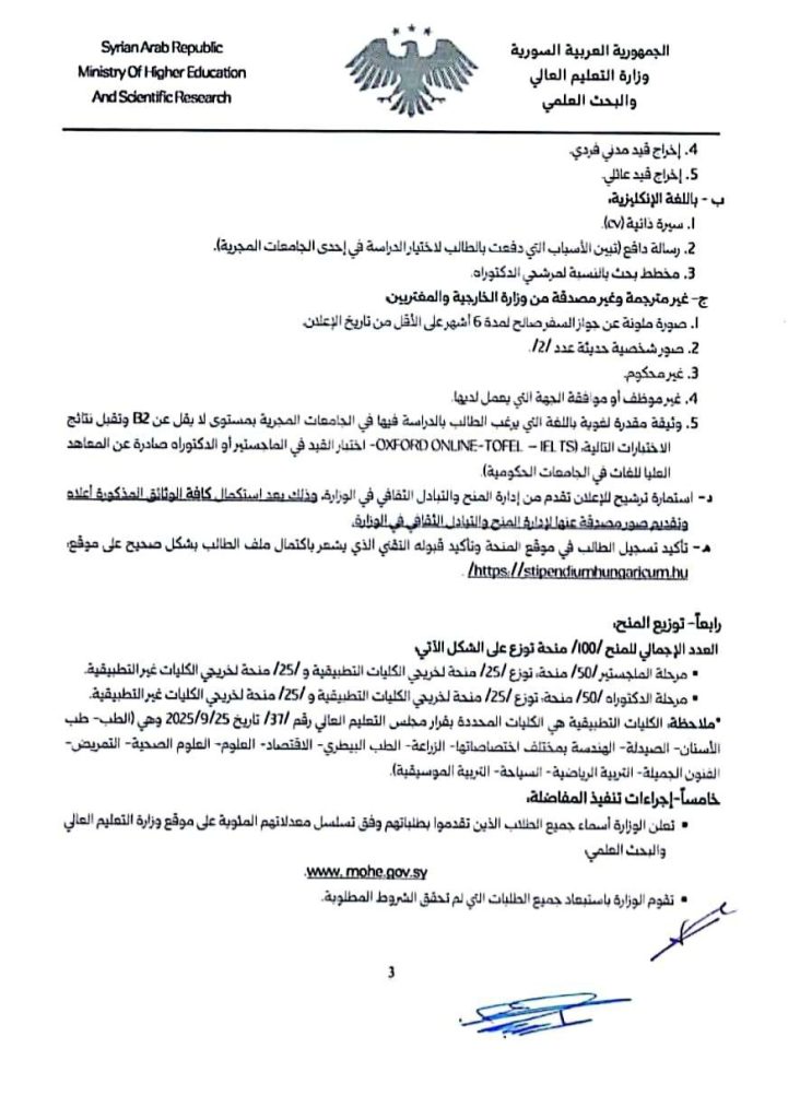 وزارة التّعليم العالي تُعلن عن منح دراسيّة في المجر لطلاب الدّراسات العليا السّوريّين لعام 2026/2027