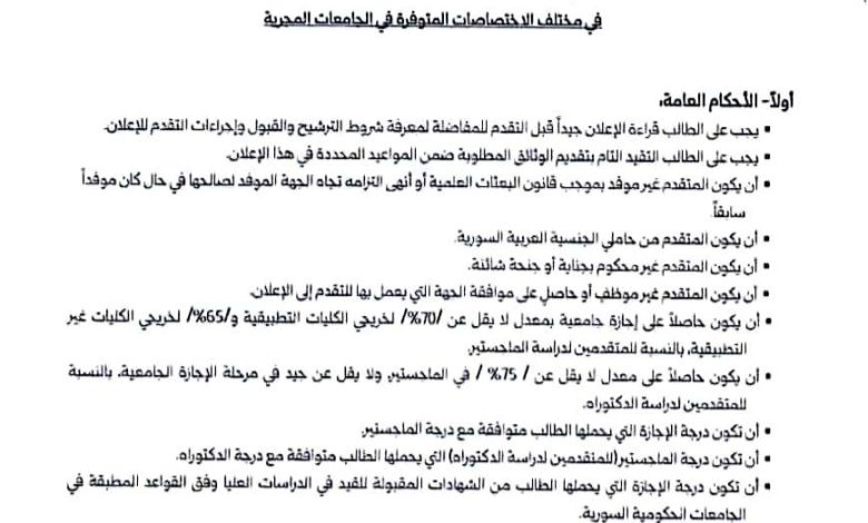 تعلن وزارة التّعليم العالي والبحث العلمي عن المنح الدّراسيّة المقدّمة من حكومة المجر للطلاب السّوريّين لمرحلة الدّراسات العليا ( ماجستير ودكتوراه ) للعام الدراسي 2026/2027 في مختلف الاختصاصات المتوفّرة في الجّامعات المجريّة .