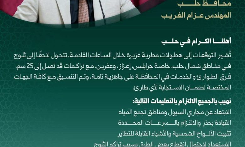 تُشير التّوقّعات إلى هطولات مطريّة غزيرة خلال السّاعات القادمة ، تتحوّل لاحقاً إلى ثلوج في مناطق شمال حلب ، خاصّة جرابلس ، إعزاز وعفرين ، مع تراكمات قد تصل إلى 25 سم .