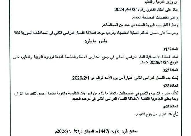 وزارة التّربية والتّعليم تمدّد العطلة الانتصافيّة للعام الدّراسي الحالي في جميع المدارس العامّة والخاصّة حتى تاريخ 31-1-2026 ضمناً ، وذلك حِرصاً على انتظام العمليّة التّعليميّة وتوحيد انطلاقة الفصل الدّراسي الثّاني في المحافظات السّوريّة .