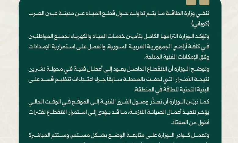بيان صادر عن وزارة الطّاقة في الجّمهوريّـة العربيّـة السّـوريّـة بخصوص ما يُتداول حول قطع المياه عن منطقة عين العرب (كوباني)