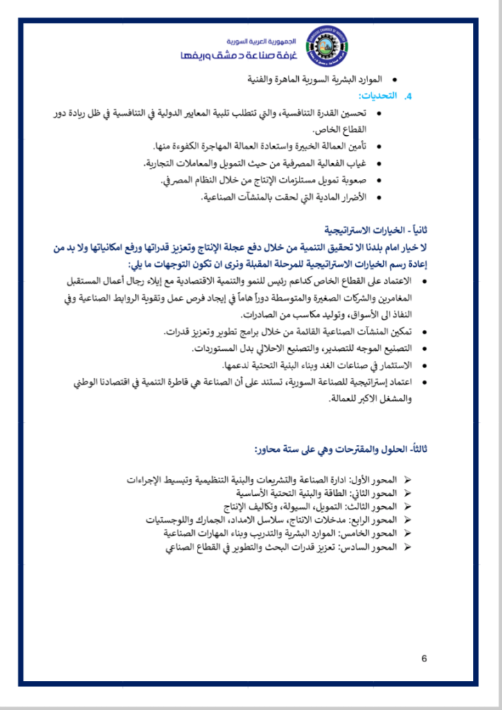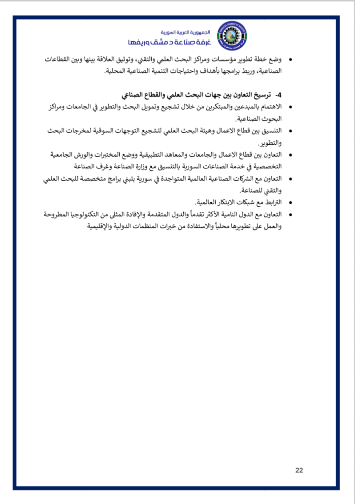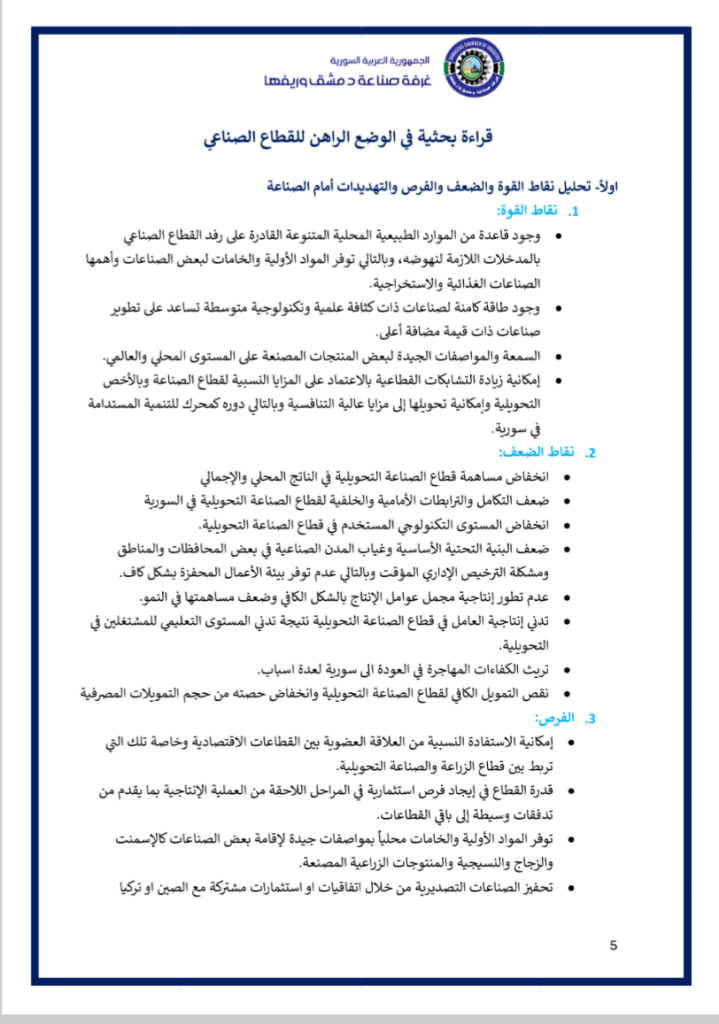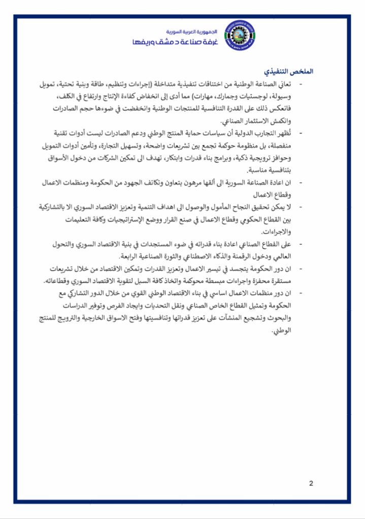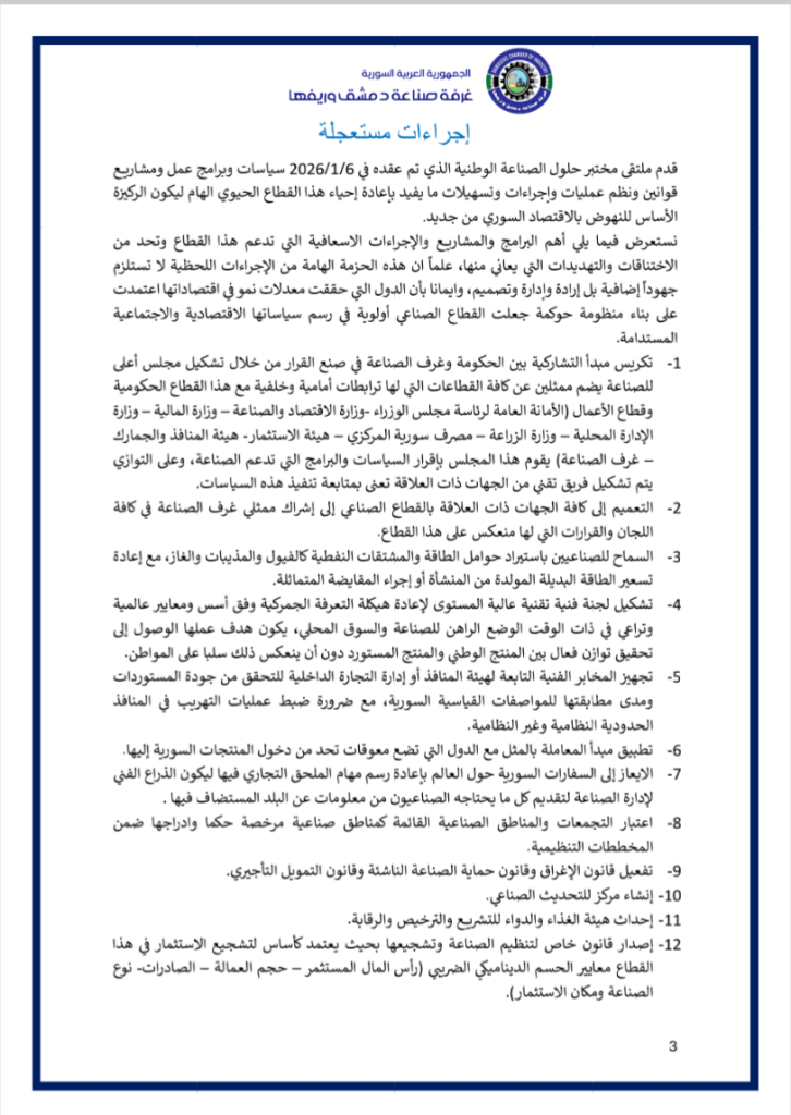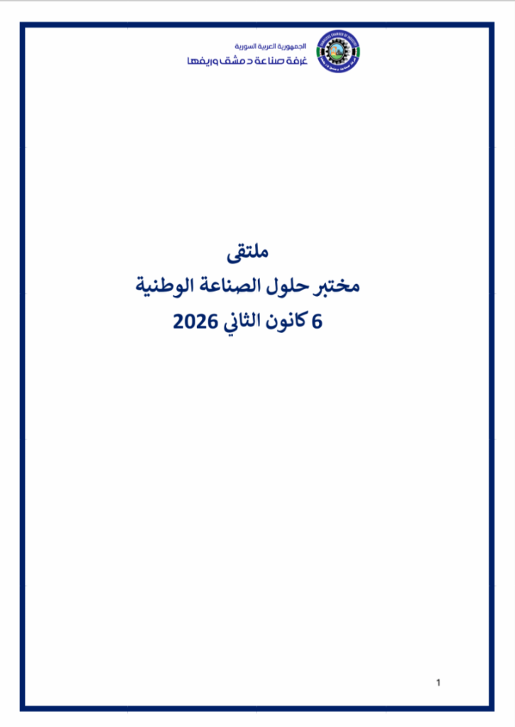 نضع بين أيديكم فيديو عن ملتقى ” مختبر حلول الصّناعة الوطنيّة ” الذي أقامته غرفة صناعة دمشق وريفها في السّادس من كانون الثّاني 2026 بحضور معالي وزير الاقتصاد و الصّناعة و وزير الاتّصالات و التّقانة و وزير الماليّة و حاكم مصرف سورية المركزي و محافظ مدينة دمشق و عدد من المسؤولين و الذي خرج بوثيقة استراتيجيّة و مصفوفة تنفيذيّة للنهوض بصناعتنا الوطنيّة و إعادة ألقّها ..