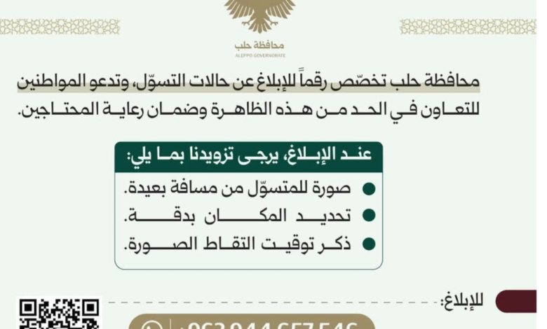 الرئيسية/الأقسام الإخبارية/أخبار محافظة حلب/محافظة حلب تخصّص رقماً للإبلاغ عن حالات التسول و تدعو المواطنين للتّعاون في الحدِّ من هذه الظّاهرة …. أخبار محافظة حلب محافظة حلب تخصّص رقماً للإبلاغ عن حالات التسول و تدعو المواطنين للتّعاون في الحدِّ من هذه الظّاهرة …. غاليامنذ ساعة واحدة0 54 أقل من دقيقة غاليامنذ ساعة واحدة0 54 أقل من دقيقة فيسبوك تويتر لينكدإن Tumblr بينتيريست Reddit VKontakte مشاركة عبر البريد طباعة