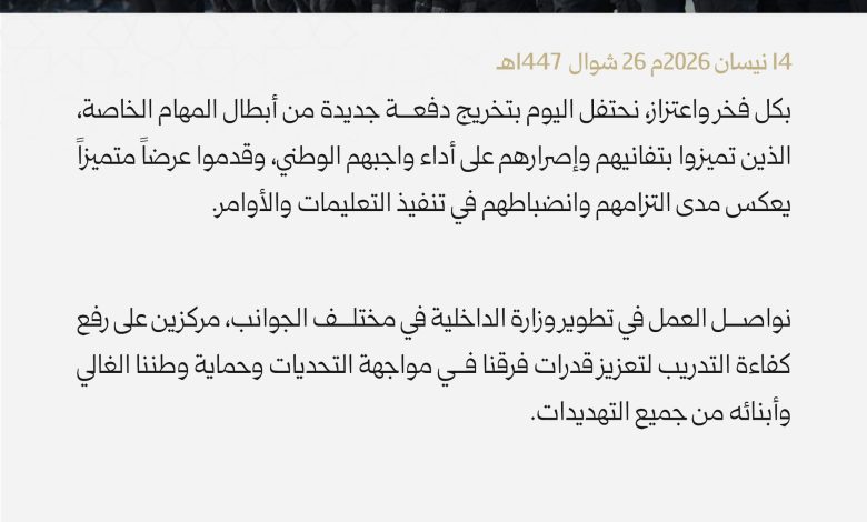 بكلّ فخر واعتزاز ، نحتفل اليوم بتخريج دفعة جديدة من أبطال المهام الخاصّة ، الذين تميّزوا بتفانيهم وإصرارهم على أداء واجبهم الوطني ، وقدّموا عرضاً متميّزاً يعكس مدى إلتزامهم وانضباطهم في تنفيذ التّعليمات والأوامر .