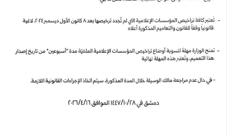 • ⁠تَمنح الوزارة مهلةً لتسوية أوضاع تراخيص المؤسّسات الإعلاميّة الملغيّة مدّة أسبوعين من تاريخ إصدار هذا التّعميم ، وتُعتبر هذه المهلة نهائيّة .