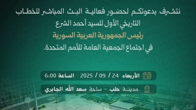 دعوة عامّة لحضور فعالية البث المباشر للخطاب التّاريخي الأول لسيادة الرّئيس أحمد الشّرع …
